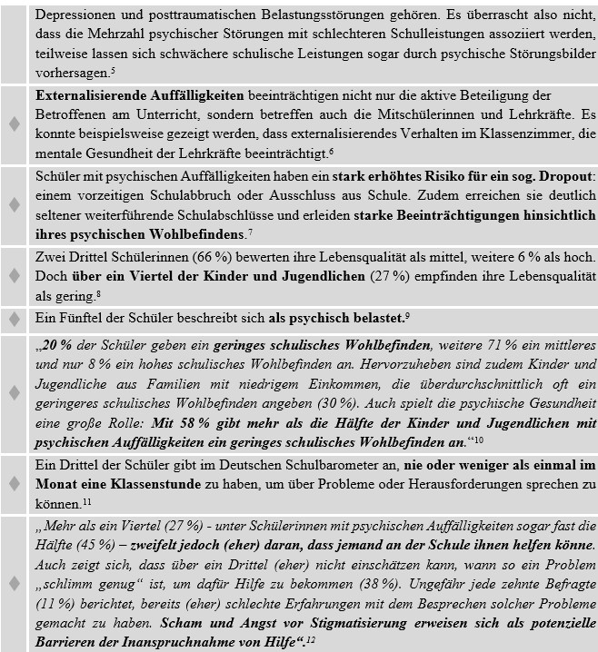 „Da sich psychische Auffälligkeiten bei Schulkindern also negativ auf die psycho-soziale Funktionsfähigkeit auswirken und weitreichende negative Folgen haben können, ist eine frühe Erkennung und Behandlung von psychischen Auffälligkeiten bei Kindern besonders wichtig. Die Schule kann bei der Prävention, der Früherkennung und der frühen Intervention eine Schlüsselrolle spielen. Kinder sind sich oft selbst nicht bewusst, dass sie Hilfe benötigen. Sie wissen meist nicht, welche Möglichkeiten es für sie gibt, um Unterstützung zu erhalten. Daher benötigen sie Personen die ihre Hilfebedürftigkeit erkennen.“ [13]