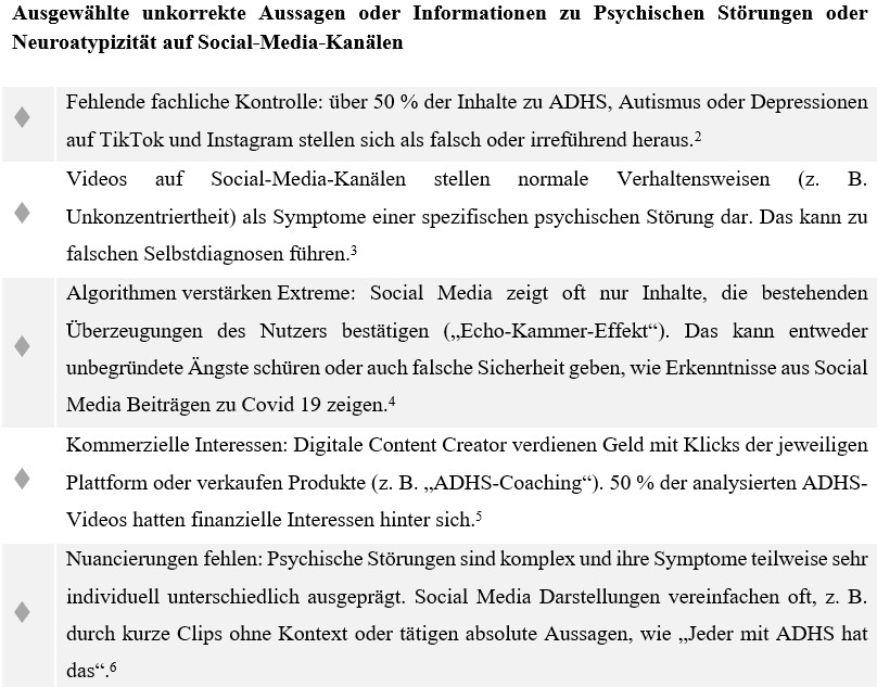 Übersicht: Ausgewählte unkorrekte Aussagen oder Informationen zu Psychischen Störungen oder Neuroatypizität auf Social-Media-Kanälen
